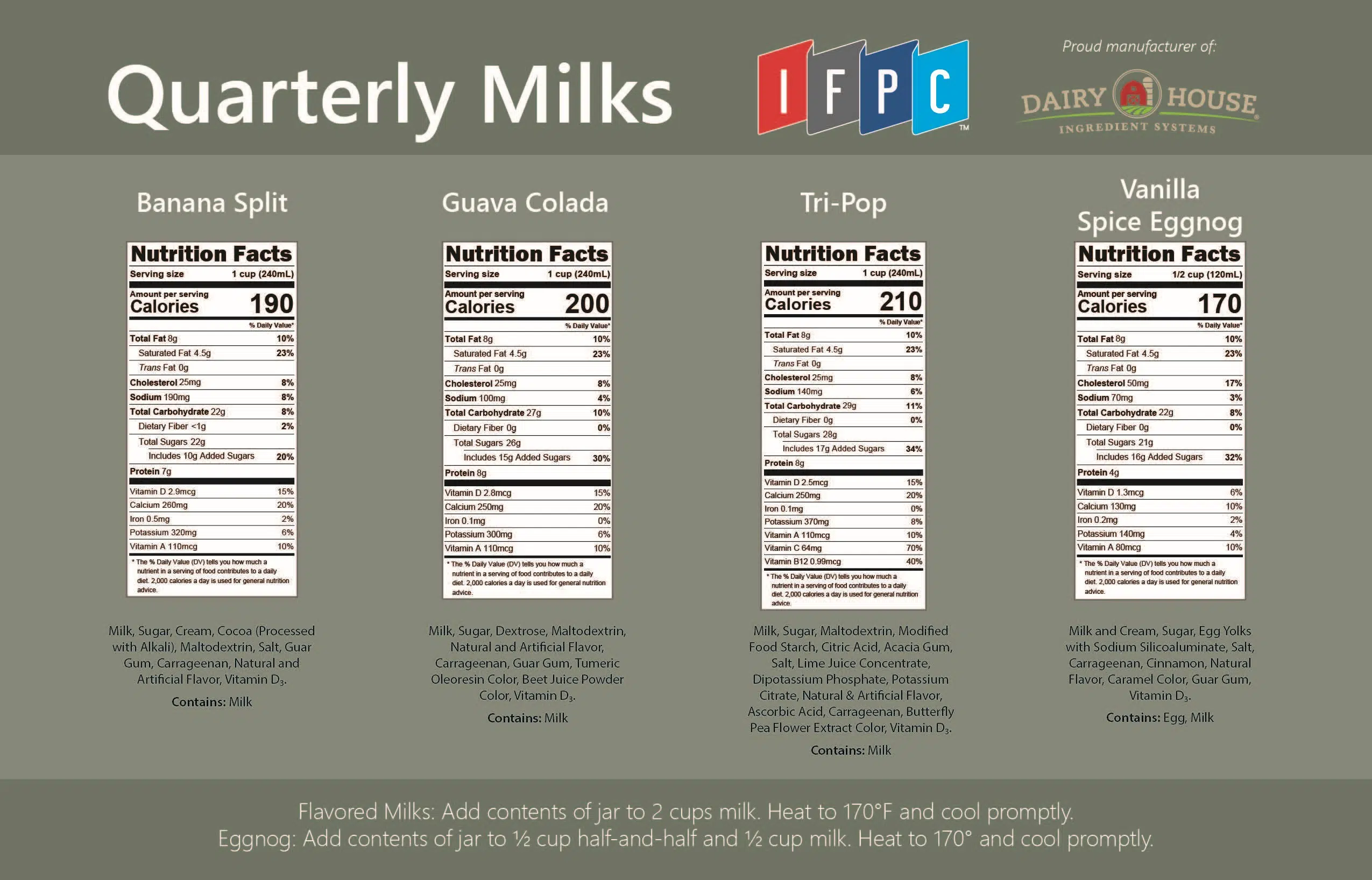 - Vanila Spice Eggnog – Velvety & rich eggnog layered with warm vanilla and subtle spices.